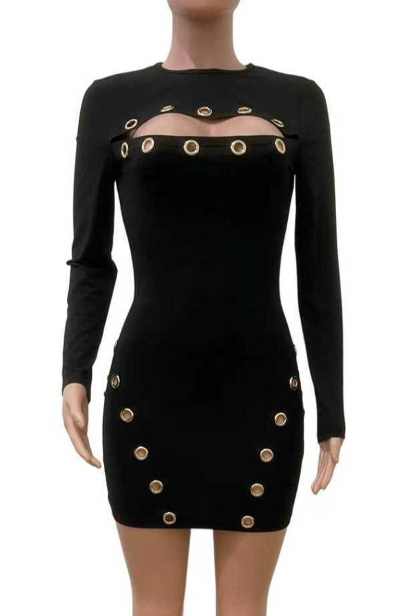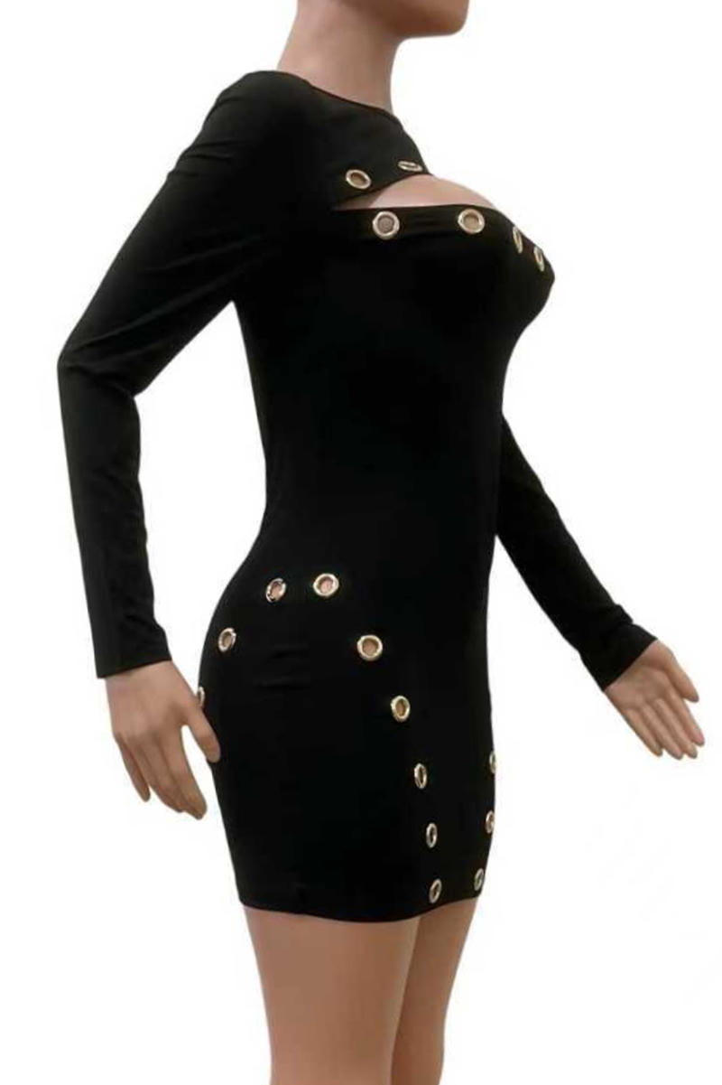 Turn heads effortlessly with this sexy plus-size mini dress designed to flatter your curves. Crafted with slight stretch fabric for comfort, it features a solid color base enhanced by delicate eyelet details. The slim fit and hollow accents create a daring yet elegant look, perfect for nights out or special occasions where you want to feel confident and stunning. Embrace your style with this sleek, breathable dress that combines allure and comfort in one irresistible piece.